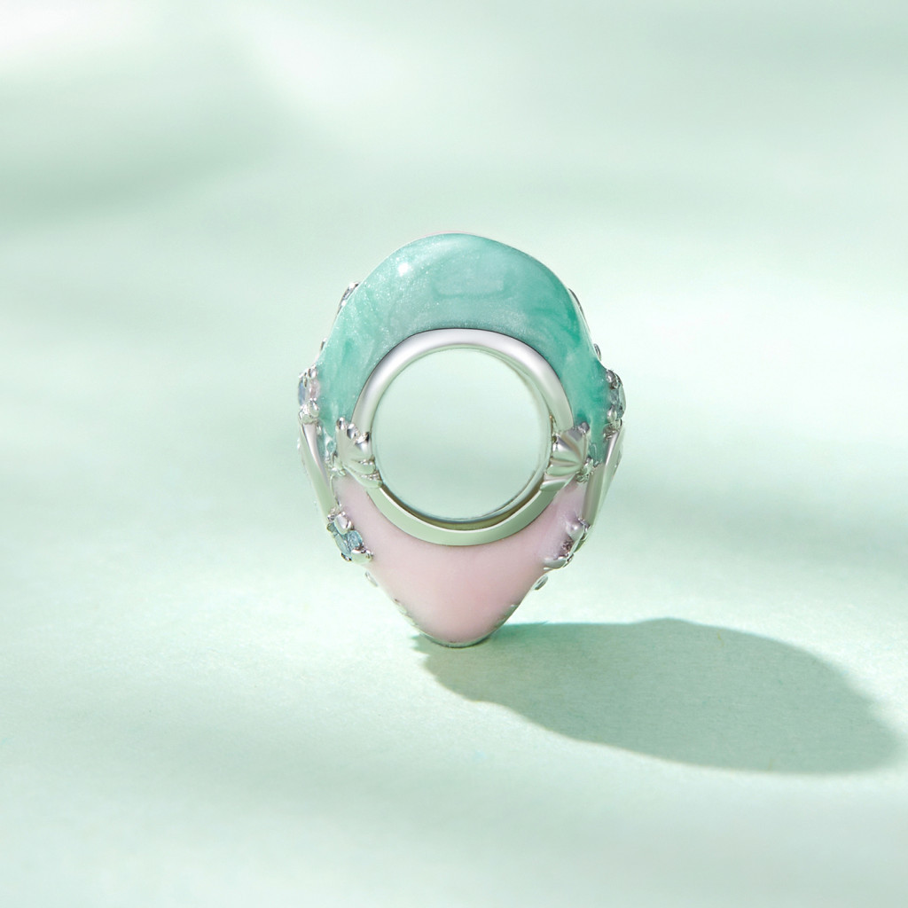 Pășește în lumea basmelor cu acest charm magic în formă de inimă, de parcă însăși Regina Zânelor l-ar fi lăsat pentru tine! Bijuteria strălucește în două nuanțe pastelate: un roz visător și un verde mentă proaspăt, care se îmbină într-o strălucire sidefie. În centrul inimii se află o coroană din argint lucrată minuțios, împodobită cu un cristal strălucitor în formă de inimă. Coroana este decorată cu pietre mici, roz și albastru-deschis, care sclipesc ca picăturile de rouă într-o pădure fermecată. Acest charm este alegerea perfectă pentru oricine crede în minuni și vrea să aducă puțină magie de basm în fiecare zi. Poartă-l pe brățara sau lănțișorul tău și amintește-ți de regina care există în tine! Se potrivește perfect cu brățările Pandora Moments. Dimensiuni: 1,1 cm x 1,2 cm. Greutate: 1,9 grame. Avertisment important pentru charmuri cu pietre: Vă rugăm să rețineți că charmurile decorate cu pietre sunt extrem de fragile. Cea mai frecventă cauză a pierderii pietrelor este impactul fizic. Dacă charmul lovește ceva, de exemplu o masă, o tocul ușii sau chiar o altă bijuterie, piatra se poate slăbi și cădea. Protejați și feriți charmul de orice impact fizic, pentru a vă bucura de strălucirea sa cât mai mult timp. Este important de menționat că garanția nu acoperă pierderea pietrelor din cauza impactului fizic.
