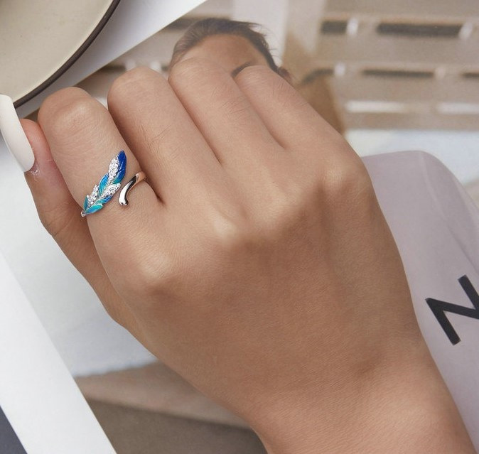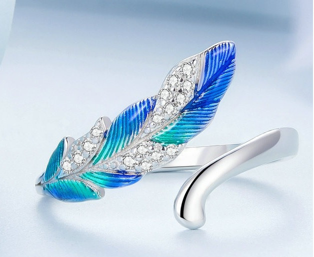Inelul nostru din argint cu pene de pasăre nu este doar un accesoriu unic și stilat pentru garderoba ta, ci datorită mărimii sale ajustabile poate fi și un cadou perfect pentru cei dragi. Pe inel se poate observa o elegantă pană albastră, care poate simboliza libertatea și eleganța ușoară.