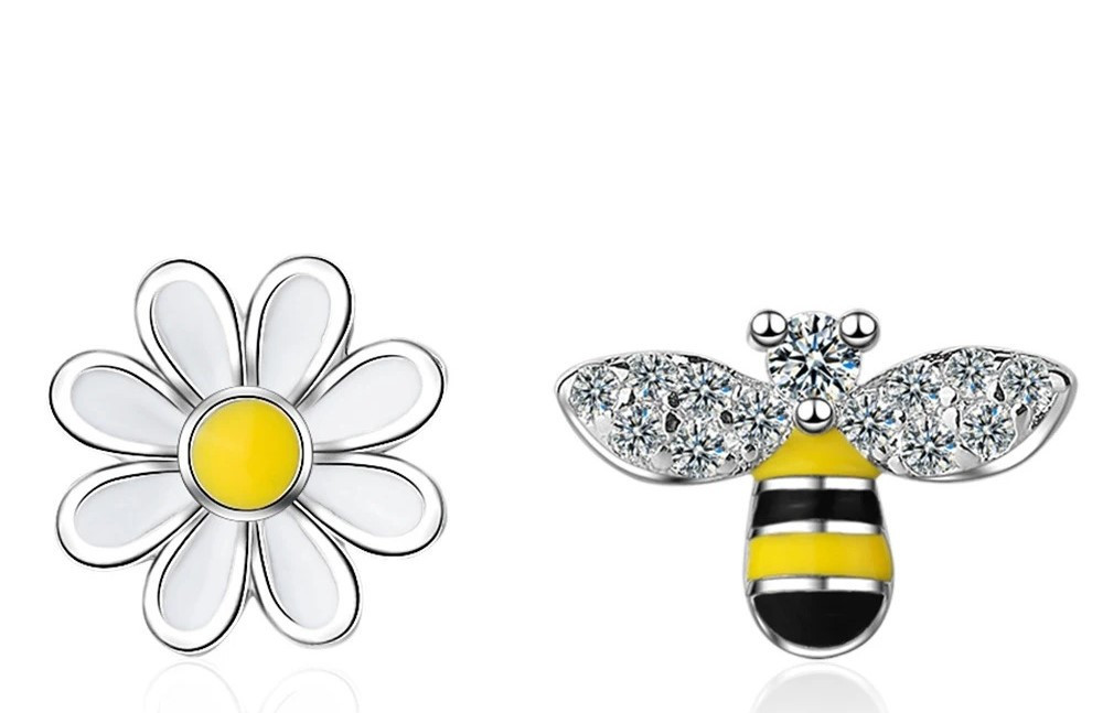 Cercei asimetrici albină și margaretă din argint