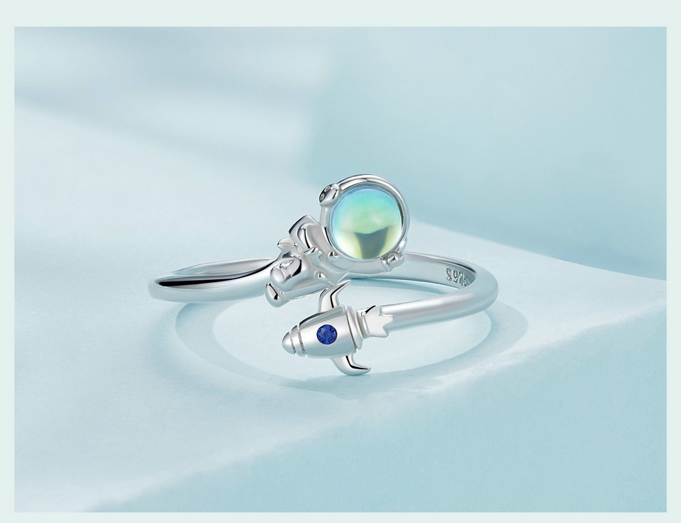 Este fabricat din argint de înaltă calitate, care asigură durabilitate și un aspect strălucitor. Strălucirea argintului și suprafața sa netedă evidențiază detaliile inelului și îl face unic prin motivul astronautului.